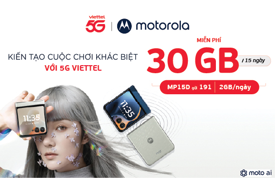 Theo đó, nhân dịp Motorola tái xuất, hai thương hiệu triển khai chương trình ưu đãi đặc biệt: Tặng 30GB data 5G miễn phícho khách hàng Viettel khi sử dụng điện thoại Motorola 5G.