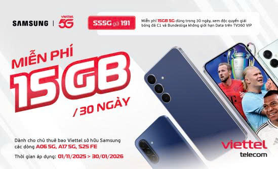 Thứ tư, 12/11/2025Viettel Telecom chính thức công bố hợp tác cùng Samsung Việt Nam triển khai gói data SS5G dành riêng cho người dùng các dòng điện thoại Samsung Galaxy A06 5G, A17 5G và S25 FE. Đây là chương trình ưu đãi nằm trong chuỗi hoạt động hợp tác chiến lược giữa Viettel và các hãng sản xuất thiết bị nhằm phổ cập 5G đến đông đảo người dùng Việt Nam, giúp khách hàng dễ dàng trải nghiệm tốc độ 5G vượt trội trên các thiết bị phổ biến.