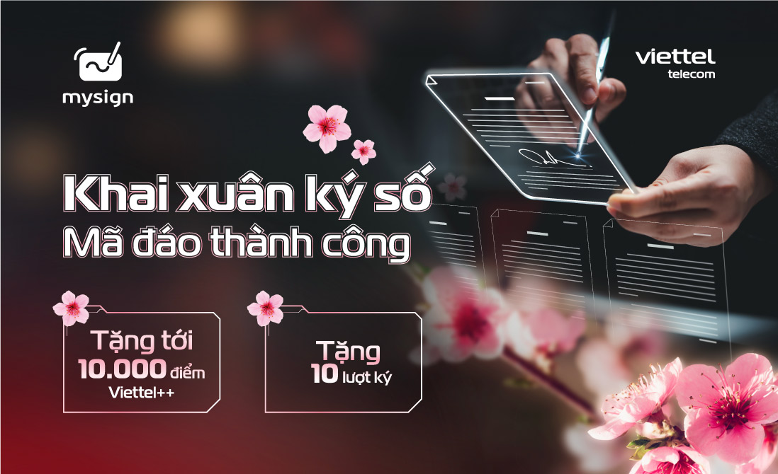 Khai xuân với công cụ số hóa thông minh chính là cách để khởi đầu năm mới hiệu quả, chuyên nghiệp và sẵn sàng tăng trưởng. Đặc biệt nhân dịp mừng xuân mới Bính Ngọ, Viettel triển khai chương trình ưu đãi khai xuân đặc biệt trên toàn quốc, chào mừng năm mới thành công thuận lợi: Từ ngày 10/02/2026 đến 10/03/2026, khi đăng ký thành công dịch vụ qua ứng dụng MySign hoặc giới thiệu thành công khách hàng mới, quý khách hàng nhận ngay: